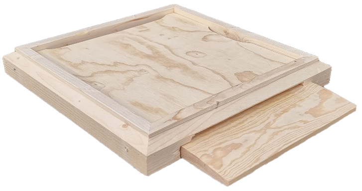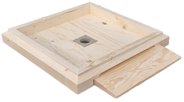 Bina har ett utrymme under iläggsskivan som kan behövas då bina sitter trångt eller då man flyttar kupan. Det är också praktiskt vid varroakontroll då det finns plats för ett varroagaller. Ventilationshål med rostfritt galler.