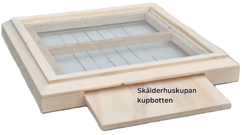 Vi har utvecklat Skälderhuskupan med nya lösningar på en rad detaljer som gör den ännu bättre. Den främsta är att det inte krävs någon perforerad masonitskiva mellan skattlådorna för att undvika vildbygge. Det medför att spärrgallret syns från utsidan, vilket är en fördel.